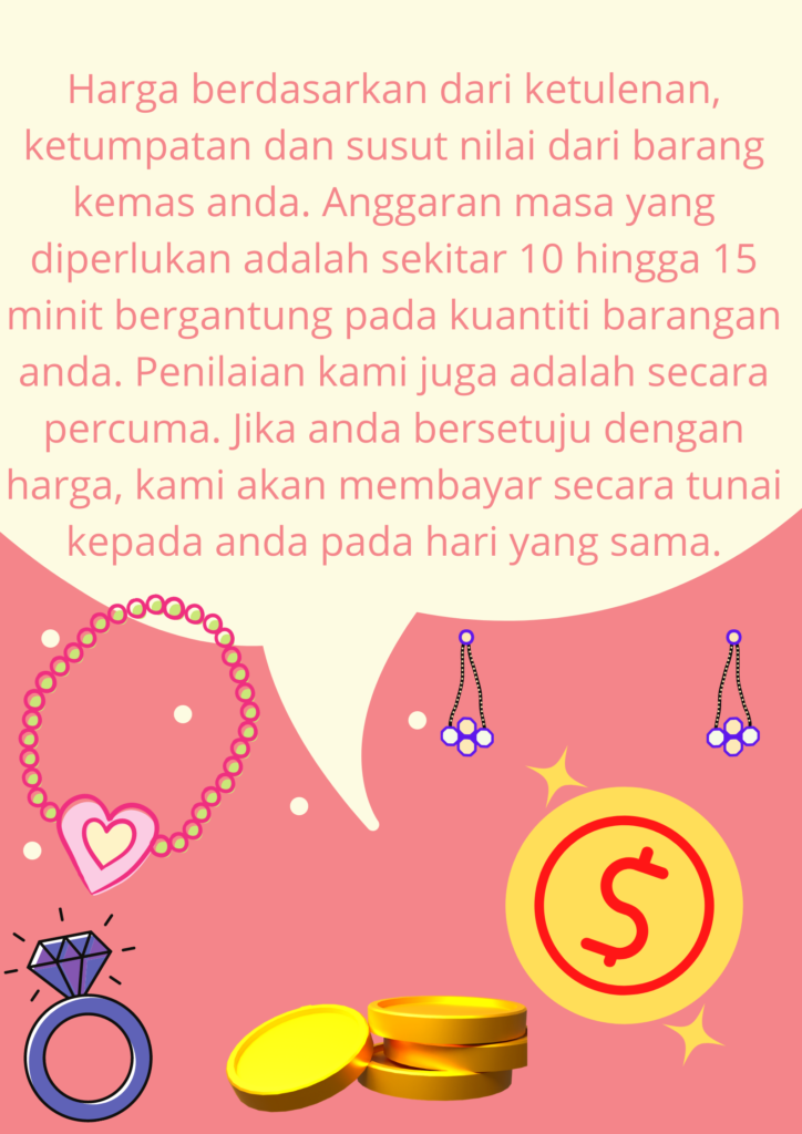 Untuk setiap transaksi yang berjaya, pelanggan akan dibayar dengan bayaran secara TUNAI!. Betul. Bayaran TUNAI akan diberikan. Bagi semua barangan kemas adalah berdasarkan ketulenan emas.