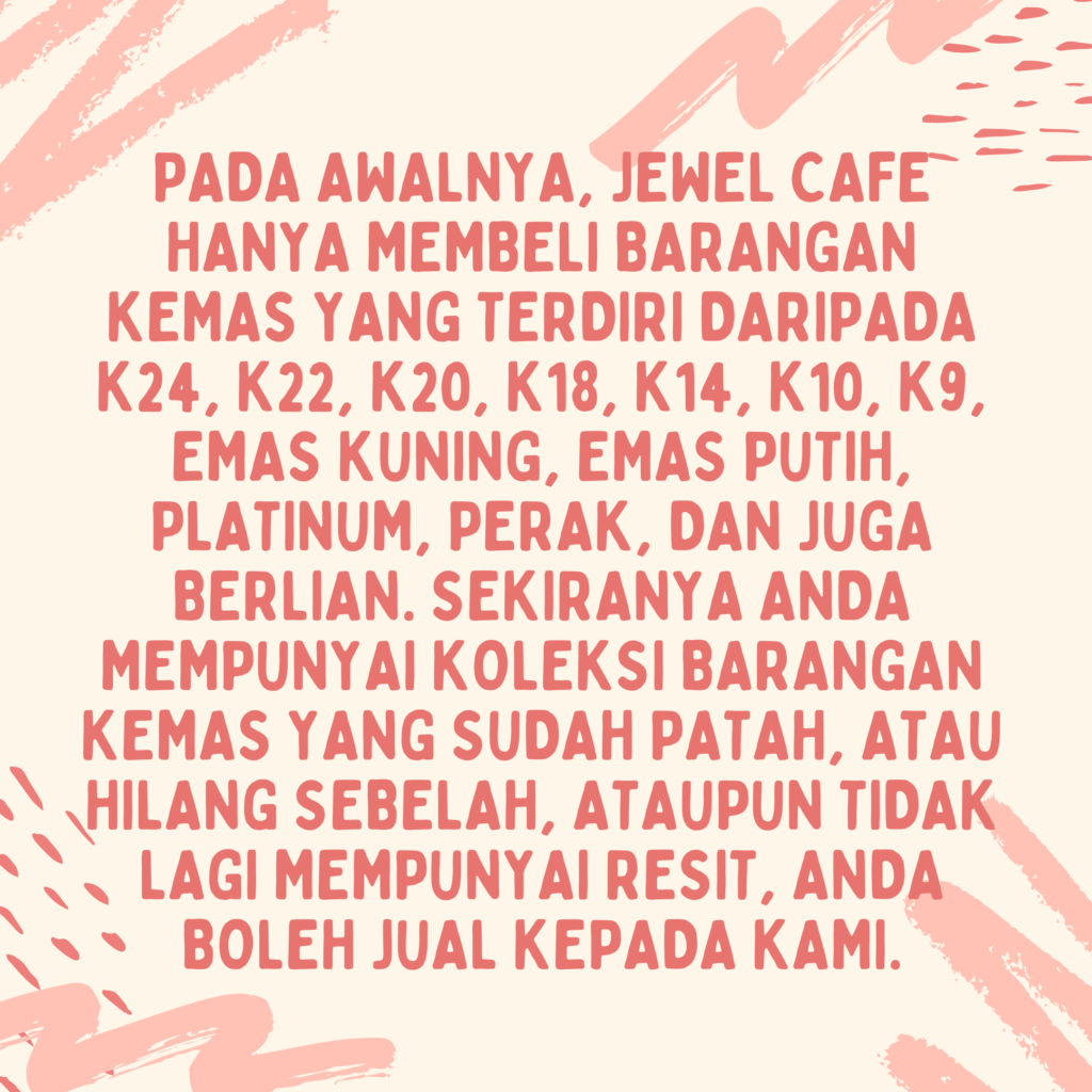 Jewel cafe is Japan No.1’s Recycle Store right here in Malaysia. We buy jewelry from yellow gold, white gold, platinum, silver and diamond. Besides that we also buy branded items like bags, wallet and watches to even electronic device.