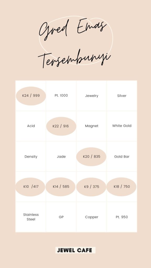 Untuk barangan kemas, kami bukan sahaja membeli emas kuning malahan turut membeli emas putih, berlian, platinum, perak dan juga barang perhiasan kemas. Dari gred K24 sehingga K9. Jika barang kemas anda tiada resit, ataupun sudah putus mahupun hilang sebelah, kami turut boleh membelinya.